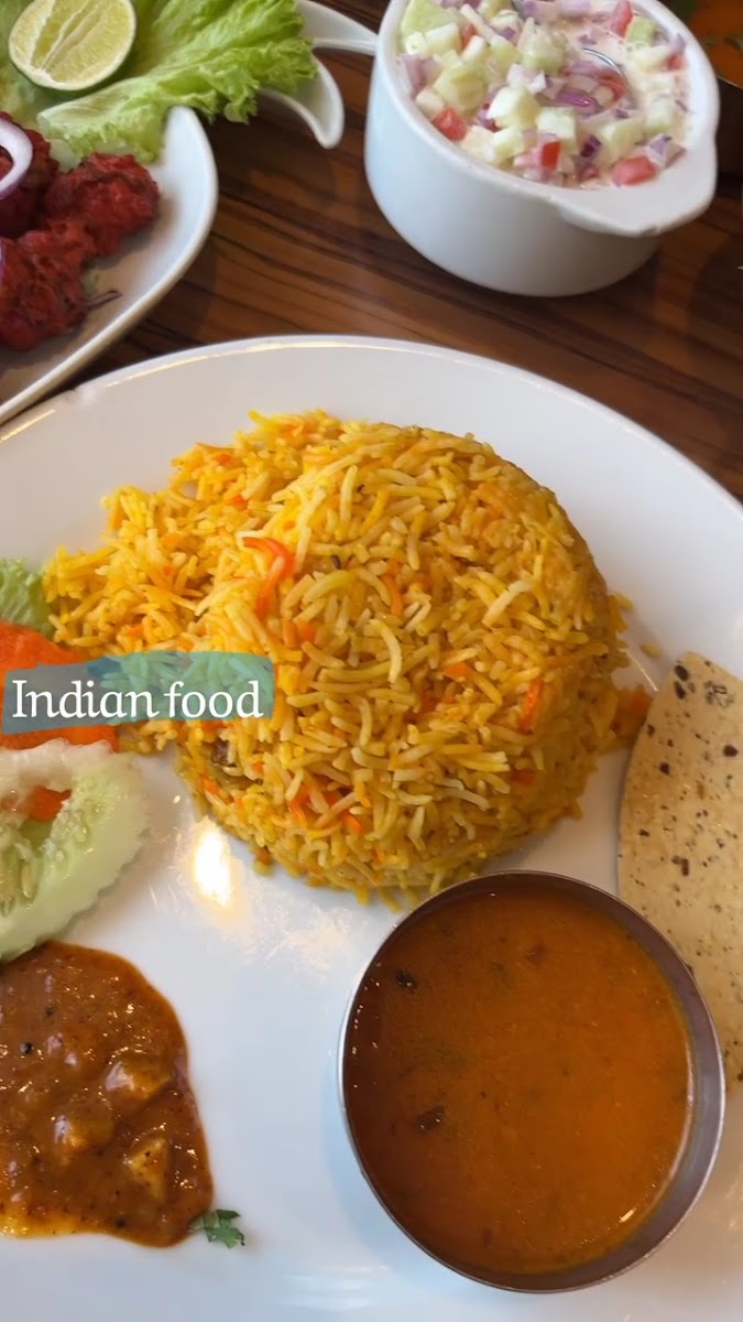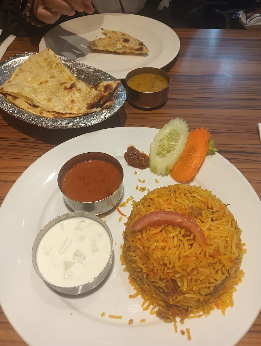 It is such a wonderful dining experience. The two waiters are patiently waiting for our order. We ordered vegetarian thali set that comes with a serving of naan. The side dishes are so nice, the naan is crispy and fresh. We had paneer with black dhal and tomato, which is excellent! What a great choice. We added another serving of Kashmiri Pulao rice, and it is so good. The cashew nuts are crunchy and fresh and added such flavour to the rice. We had maggo lassi to finish. What a wonderful dining experience. Highly recommended.
